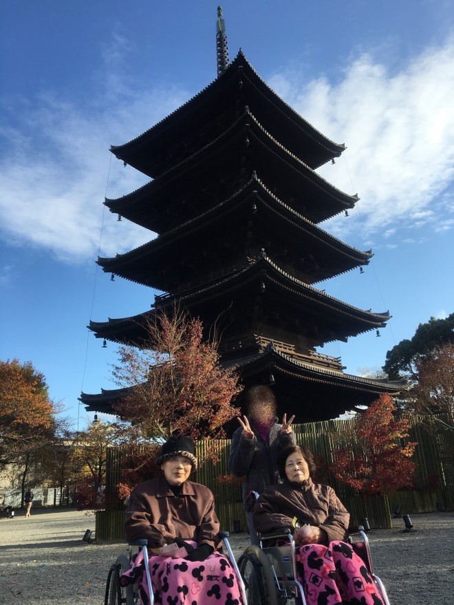 すぃーとハンズ下京デイサービスで「東寺」まで紅葉狩りに行ってきました\(^o^)/初日は「北野天満宮」でしたが、2日目は「東寺」です♪少し寒かったですが・・・(汗)ご利用者様も「気分転換になったよ♪」と喜ばれていました。 撮影スタッフの方々がおられまして☆賑わっていました。 金箔入りのお茶を頂きました。ご利用者様も「美味しいお茶やなぁ♪」と絶賛でした!
