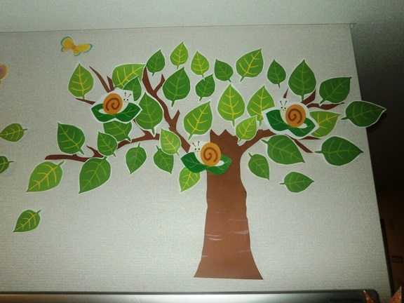 4月には桜の花の絵をはり桜の木でしたが、5月には桜から新緑に衣替え。