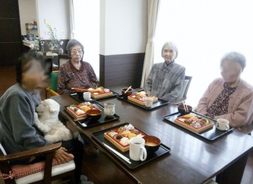 お花見を計画していたのですが、あいにくの雨天のためホーム内で昼食会を行いました。