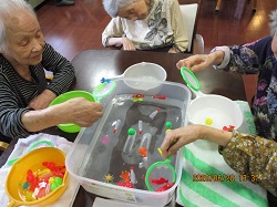 梅雨でジメジメした季節を涼しく感じてもらおうと皆さんで金魚すくいをしました^^