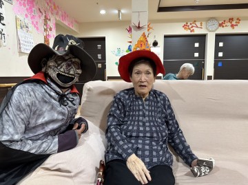 当日は、扮装した職員がお菓子を配り記念撮影を行いました。