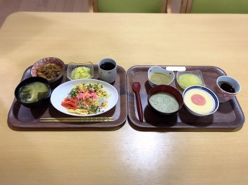 今日は皆でちらし寿司をたべました。彩を考えて盛り付けしてみました。きざみ食も彩を考えました。