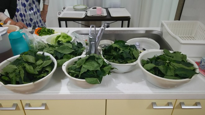 山盛りの唐辛子の葉が皆でとると